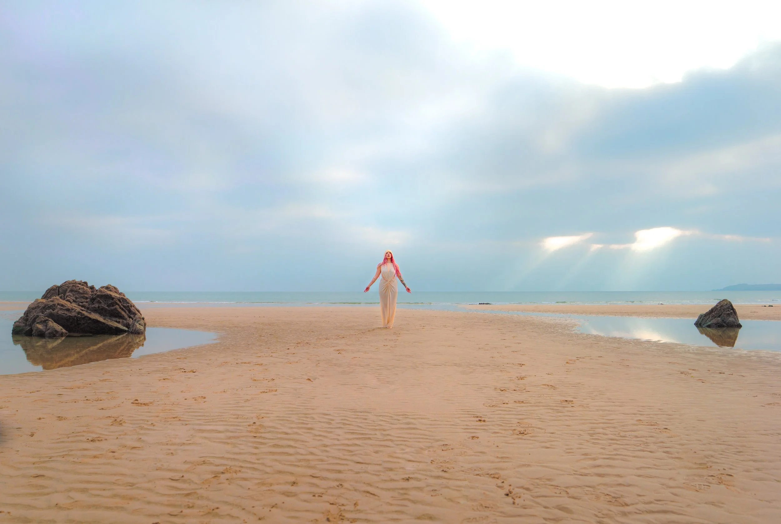 A self-shot min-movie that led me to discovering a whole new layer to my creative direction. see here. When Venus entered Aries (my 5th house of creativity) I was possessed by the vision of this fallen warrior laden with pain - reflective of a recent romantic and locational transition. As I spontaneously set out to shoot this, with the help of my mother on makeup, the shoot took a life of its own. As I began capturing the scene of this warrior - Adaon - pulling himself out of the dirt in which he fell, the clouds parted and the sun began to reveal itself. The whole day was rainy and overcast which dictated the mood of the shoot, but the emergence of the sun changed its tone. Now the warrior was not sorrowful, but experiencing a transcendental resurrection. He felt the light again, it was the dawning of a new age for him, not a mournful end.